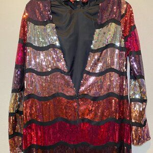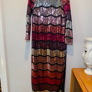 Asos Sequin Dress in multi shades of Pink. Black sheer detail. Lined (not see thru). Mock neck. Open V back with zipper