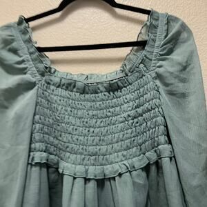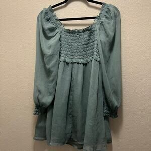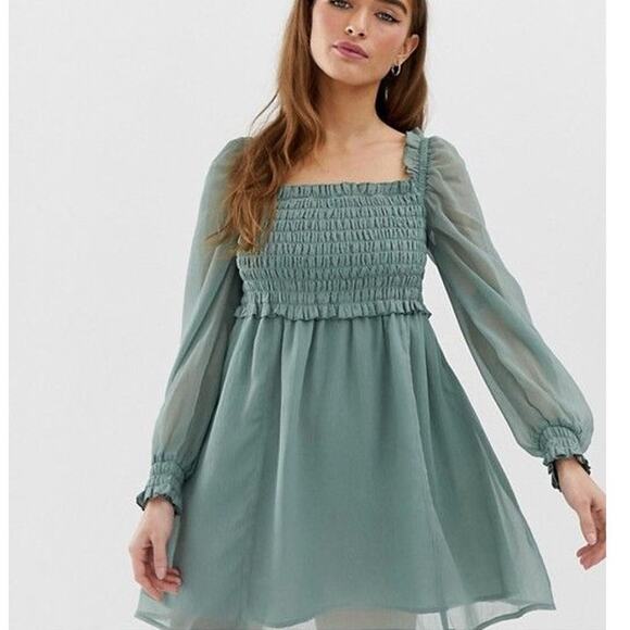 Asos Teal Green Smocked Chest Sheer Balloon Sleeve Babydoll Mini Dress Size 6