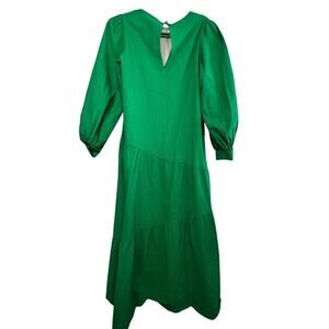 Features: puff sleeve, midi length, v neck with strap, unlined, lightweight, asymmetrical tiered skirt