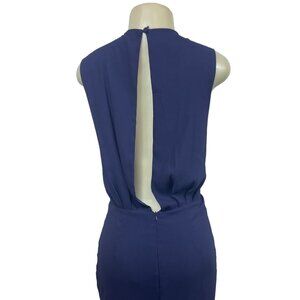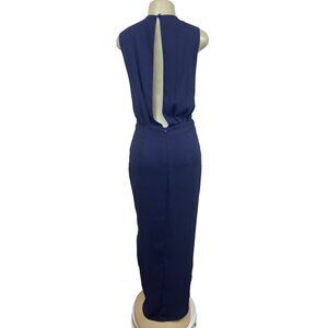 This Asos women's blue dress is a stylish twist plunge maxi dress. Made from polyester, it features a mock deep v-neck and a slit on the back for added allure. It is in excellent used conditions with no holes, rips, or stains - please see pictures. You can find measurements in the last picture.