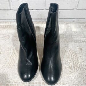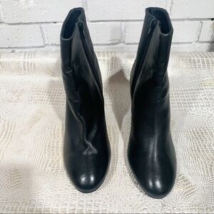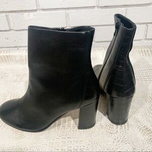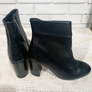 Side fastening. Mock-croc panel. Round toe. Textured tread. High block heel.