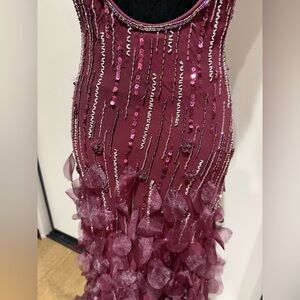 Luxurious silk dress by Aspeed. Features intricate beading. Rich burgundy color. Some beading missing but not super noticeable.