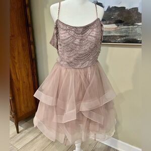 Aspeed Pink Ruffled Layered Off Shoulder Beaded Short Gown Semi-Open Back L