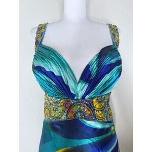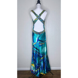 Aspeed Y2K VTG Sequin Bead Satin Flowy Dress Blue Backless XL Prom Formal Fairy