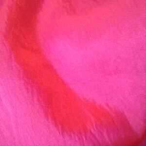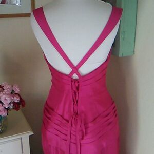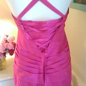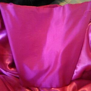 I have two of these, one L and one XL. Gorgeous rich pink formal in a dupioni like fabric that shimmers red, pink and silver and looks like silk. Bodice has built in bra with pleats over chest and a FABULOUS jeweled embellishment at the center of the sweetheart neckline. Those pleats are repeated at the hips. Lacing at back allows for adjustment, and adds a sexy corset detail. Hem ends in a mermaid shape, the net petticoat keeps the shape defined. Fully lined. Side zip. L measures. 40 at chest, 32 at waist, 39 at hips. 56 long from shoulder to hem. The color is AMAZING and perfect for now.