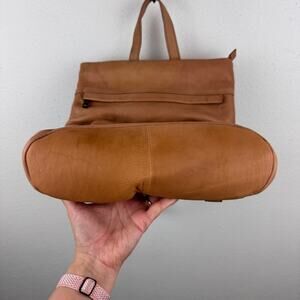 Soft tan leather, two exterior zip pockets, top zip closure, adjustable straps, interior pockets, padded tablet sleeve.