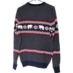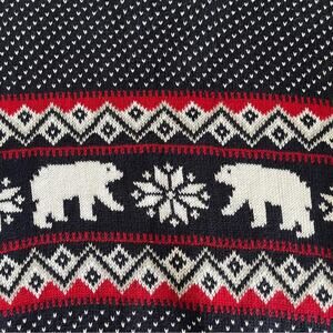Navy blue, red, and white knit aweater. Round neck. Tight knit. Fair Isle like design with polar bears.