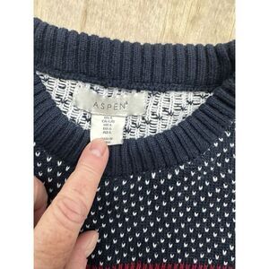 This Aspen sweater in size L features a Fair Isle pattern with a polar bear motif and snowflake accents. Made from 100% cotton in blue, red, and white, this tight-knit pullover has a crew neck and long sleeves, perfect for skiing or holiday festivities.