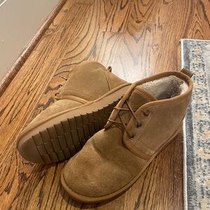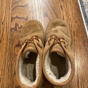 Stylish tan suede ankle boots with cozy lining. Perfect for casual wear.