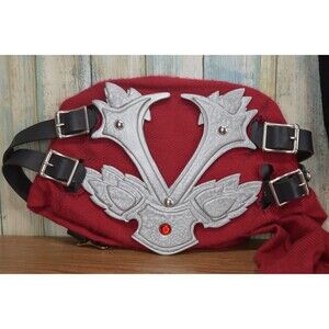 * Waist Sash with Metal Emblem: A red fabric sash with a detailed leather and metal waist buckle featuring a distinct, intricate silver emblem.