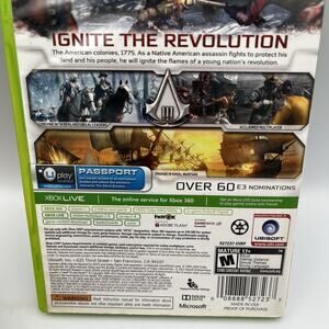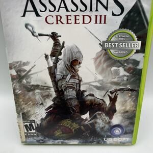 The product is the Xbox 360 game "Assassin's Creed III Platinum Hits", published by Ubisoft. It is part of the popular "Assassin's Creed" video game series known for its action and adventure gameplay. The game is rated M for mature audiences and is a complete-in-box (CIB) version, including the game, case, and inserts. This product offers an immersive gaming experience for fans of the Assassin's Creed series and provides hours of exciting gameplay on the Xbox 360 platform.