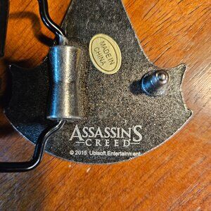 The product is a rare red silver belt buckle from the 2018 release of the video game "Assassin's Creed". This unique accessory is a must-have for fans of the historic action-adventure series, adding a touch of gaming flair to the wearer's outfit. With its exclusive design and tie-in to the popular franchise, this belt buckle is a special and collectible piece for any vintage accessory enthusiast.
