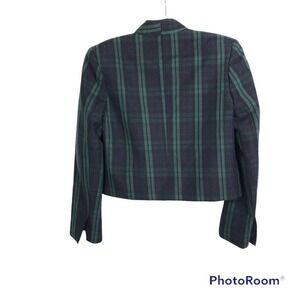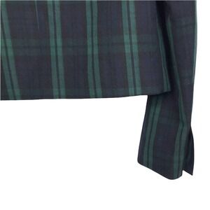 Assembly New York plaid jacket. Green and black all over plaid print. Leather panel lace. One snap button bottom closure. Front side slant pockets.