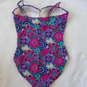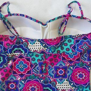 One Piece Swimsuit from Love Your Assets by Sara Blakely, Spanx (Style #1713). This bright and beautiful swimsuit has a middle panel with shirring and adjustable straps. The colors are hot pink, purple, teal, black, white, red... just gorgeous. This swimsuit is made of nylon and spandex. Hand wash cold/Line dry.