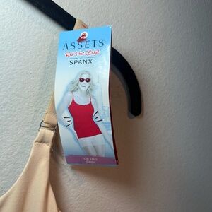 Assets by Spanx Top This Cami Shapewear Shirt In the Nude Beige Color Pullover Square Neck Adjustable Elastic Straps Smoothing Panel Flattens Tummy No Slip Fabrication Under Hem Keeps Cami In Place Stretch Straight Hem Super Slimming Level Lined Red Hot Label