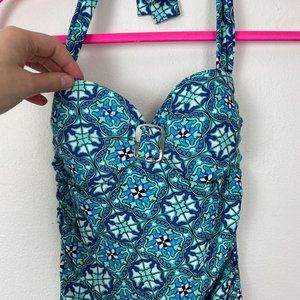 Assets by Spanx Woman's Sz S Blue Geometric Tile Halter Neck One Piece Swim Suit