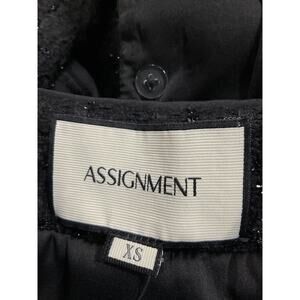 Assignment 'Bianca' Black Jacket Size XS: front button closure, lightly padded shoulders, front welt pockets with button closure, midweight tweed fabric.