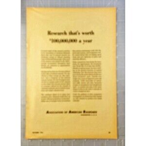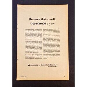 Association of American Railroads "Research Worth $100 Million a Year" Vintage Ad 1954 Railroad Magazine October 1954 About 11 x 8.5 Inches. Carefully shipped.