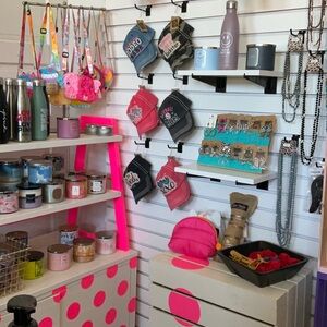 Explore a vibrant collection of accessories including hats, bags, and drinkware. Features pink, gray, and black tones.