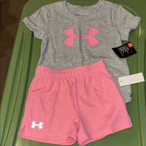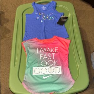 Bundle of athletic tops and bottoms in various colors. Includes pink, gray, and black items with logos.