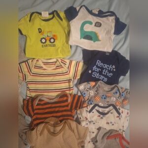This set of 17 baby bodysuits features a variety of playful designs and colors, perfect for your little one's wardrobe. Made from soft, comfortable fabric, these bodysuits are ideal for everyday wear. 16 are SS. The gray one with the dog is LS.