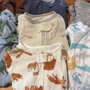 Charming Carter's baby sleepers with playful animal patterns. Features colors like blue, cream, and brown.