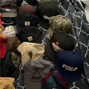 Collection of assorted baseball caps in various colors and styles. Includes brands like Carhartt, Polo, and Champion. Features colors such as black, navy, beige, and camouflage.