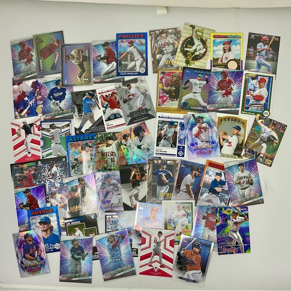 The photo shows the actual cards laid out — shiny refractors and colorful parallels everywhere! Great mix of teams and players for team collectors, prospect hunters, or anyone who loves that modern chrome look.