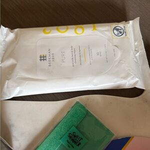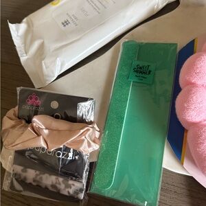 Brand new items. Pink headband with scrunchie, soft light blue socks, hair clip with scrunchie, one nail file and Beekman goat milk face and body wipes.