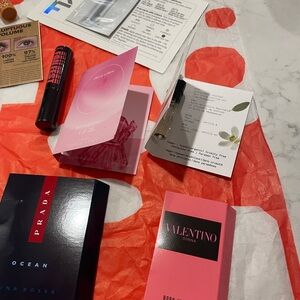 A collection of assorted beauty samples including skincare and makeup items. Perfect for trying new products. Two mini mascaras (one is Better Than Sex brand) All recent from Christmas purchases at Sephora