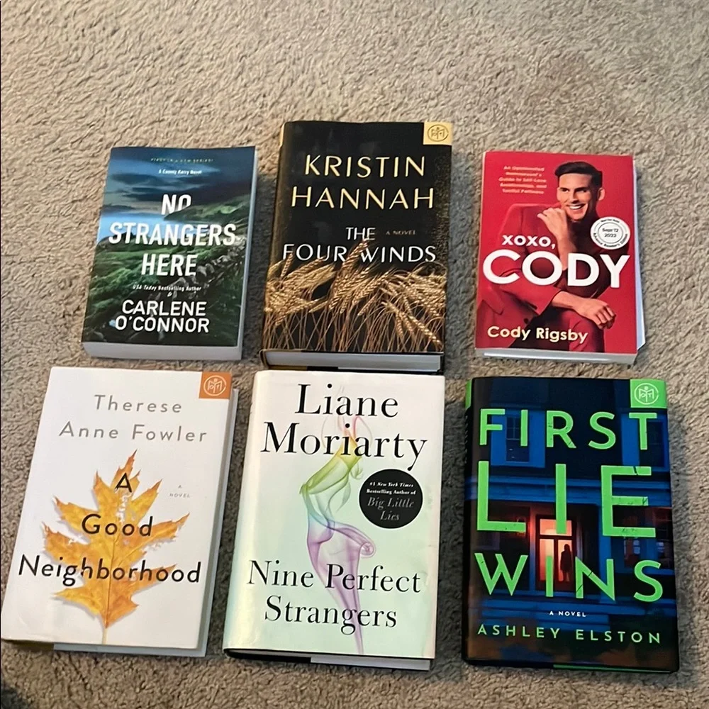 Collection of six books with vibrant covers. Includes titles by Kristin Hannah and Liane Moriarty. Perfect for book lovers. The four winds, first lie wins, xoxo Cody, a good neighborhood, nine perfect strangers, no strangers here