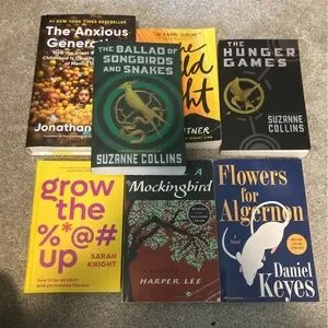 Collection of seven books with various covers. Includes titles by Suzanne Collins and Harper Lee. Vibrant and colorful designs.
