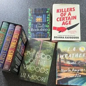 A collection of seven books with colorful covers. Includes titles like 'The Lost Bookshop' and 'Killers of a Certain Age'. all hard cover except the lost bookshop. can sell separately or together. all in good condition.