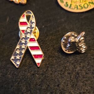 A collection of assorted brooches and pins featuring various designs. Includes a gold-tone 'Mother' brooch, a patriotic ribbon pin, and more.