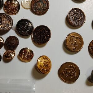 A diverse collection of buttons in various colors and styles. Includes black, white, gold, silver, brown, and more.50 year collection alot of names well over 1000 pieces antique vintage new many valuable ones alot of extras as well