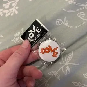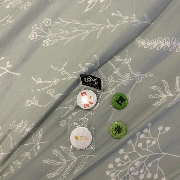 Set of four unique button pins. Fun designs and colors. Perfect for bags or jackets.