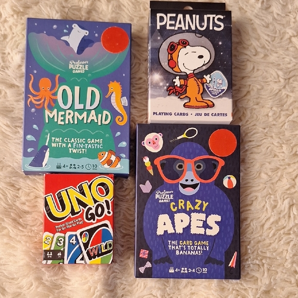 Set of four fun card games including Old Mermaid, Peanuts, Uno Go!, and Crazy Apes. Perfect for family game night.