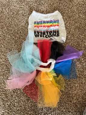Five cozy dog sweaters. Includes black ribcage tee, cream fair isle sweater, red/green Santa stripe sweater, pastel multicolor knit hoodie, and solid black hoodie. Soft knit and fleece materials. Cute seasonal and everyday styles.