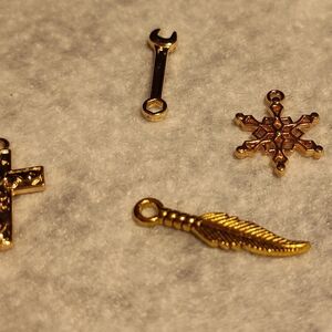 A collection of assorted gold and silver charms. Includes various shapes and designs. Great for crafters
