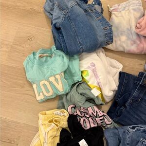 A variety of clothing items including jeans, sweatshirts, and t-shirts in multiple colors. Sweats/