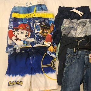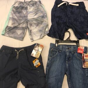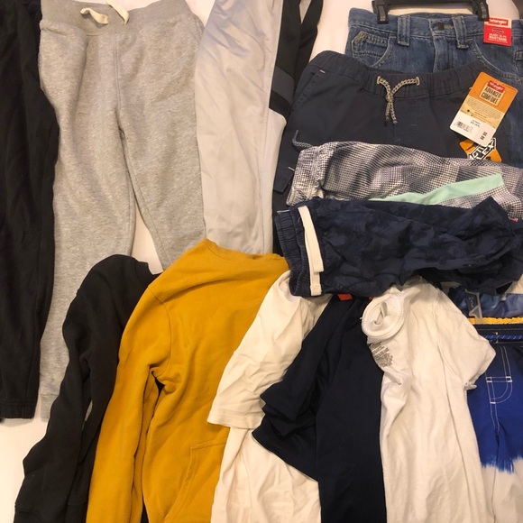 A variety of clothing items in black, gray, mustard, navy, and white. Includes pants and tops.