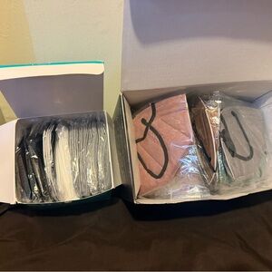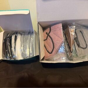 Pack of assorted color face masks featuring a stylish logo. Includes shades of pink, tan, cream, and green. About 50 individually wrapped colored and the black/gray/white are 5 per pack, and about 50 of them