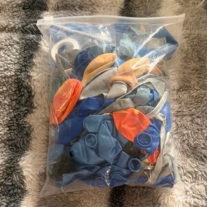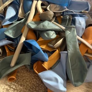 A vibrant collection of assorted balloons in various colors. New and unused! Blues, silver, beige and orange! Comes with two rolls of tape to attach together or to string! Most retailer shape some long and skinny! Some metallic some not! No idea how many probably about 100!