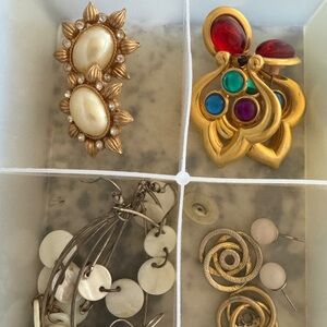 A vibrant collection of assorted pierced earrings. 18 pair. Features a variety of colors including red, blue, green and black. Mixed metals and gems. for adding a pop of color to any outfit.