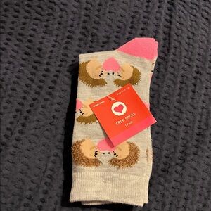 Pair of brand new hedgehog socks, JCrew never worn, 6-lot of Old Navy Mama and heart socks never worn, Aerie gray socks and a few more old Navy socks. Clean and come from smoke free and pet free home. Most like new.