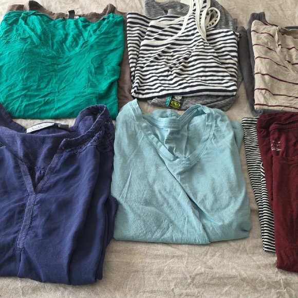 A collection of colorful tops including teal, navy, light blue, burgundy, and striped patterns. Perfect for casual wear. total of 10 shirts 1 still has the tag on it
