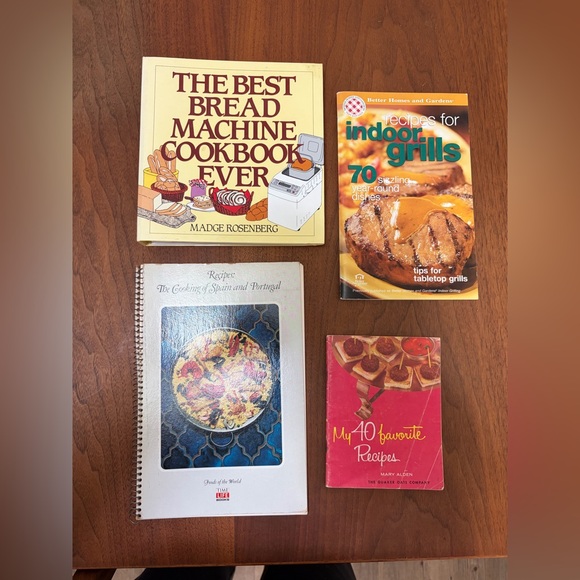 Bundle of four home kitchen cookbooks featuring colorfully illustrated covers. Includes “The Best Bread Machine Cookbook, “Indoor Grills' cookbook, Vintage, “'My 40 Favorite Recipes' booklet and “Time Life” collection