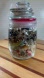A curated collection of assorted costume jewelry presented in a clear glass jar. This lot includes a variety of bangles, necklaces, bracelets, earrings, and rings. Pieces showcase diverse styles and colors, with notable items such as beaded necklaces in red and white, silver-toned bangles, chain necklaces, and colorful beaded bracelets.