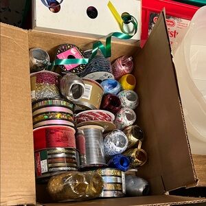A vibrant collection of assorted craft ribbons. Includes various colors and patterns for creative projects.