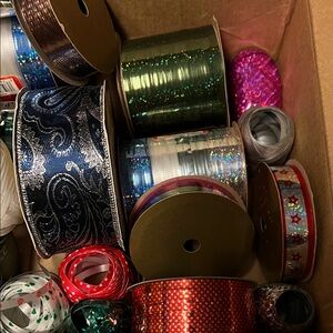 A vibrant collection of assorted craft ribbons. Includes colors like red, green, silver, and blue. Perfect for crafting and gift wrapping.